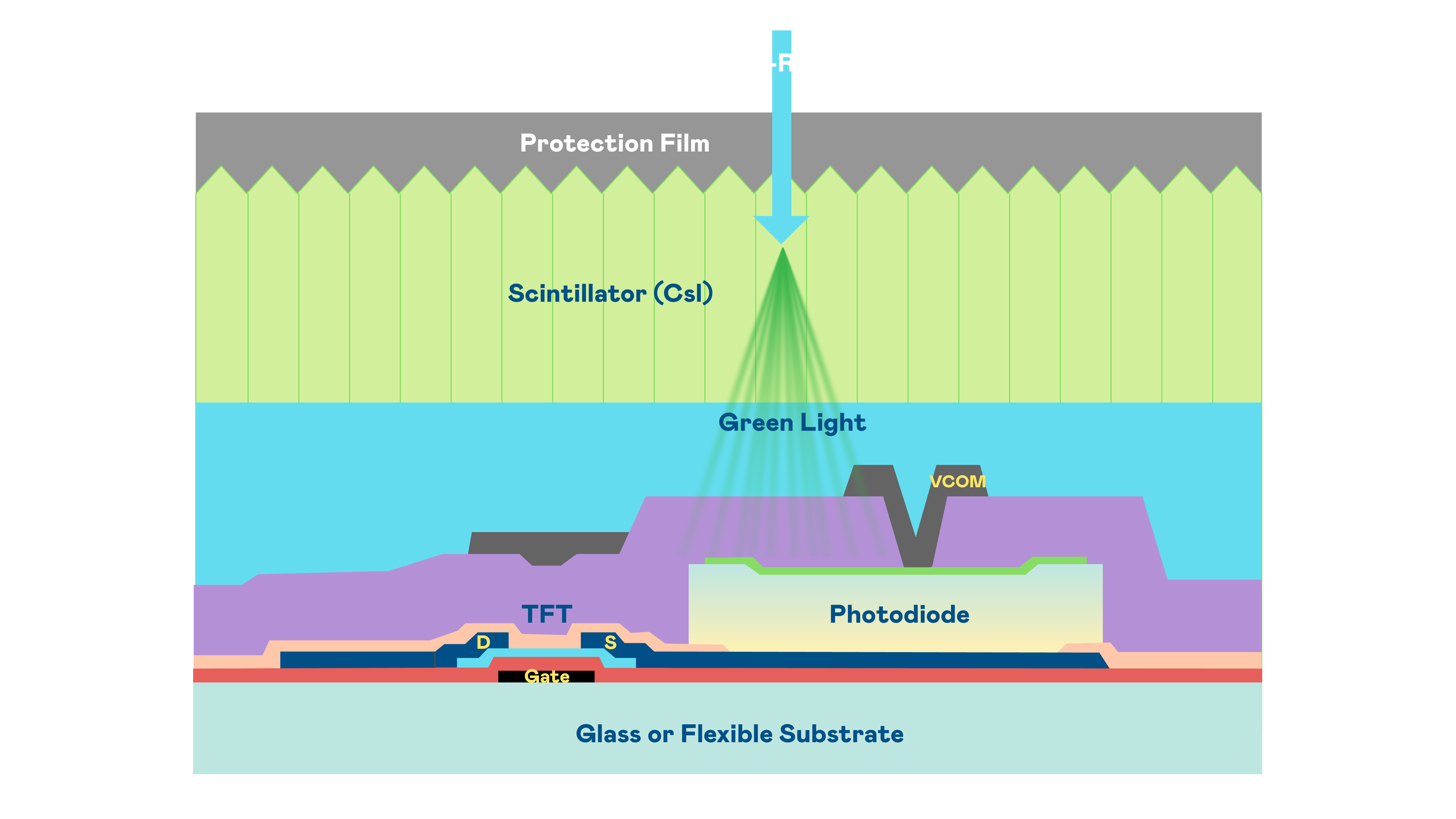AG百家乐试玩的X光影像感测阵列使用薄膜电晶体 (TFT) 作为每个像素的读取开关,搭配光电二极体(Photodiode)的光电转换元件,用以感测X光影像讯号。
